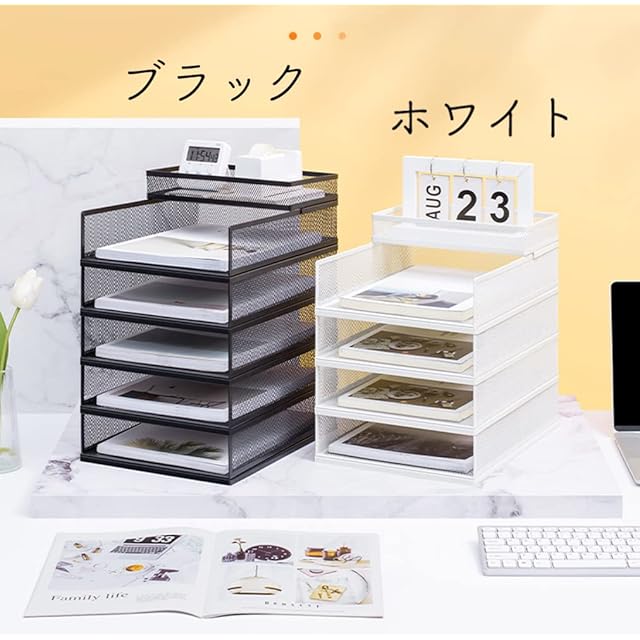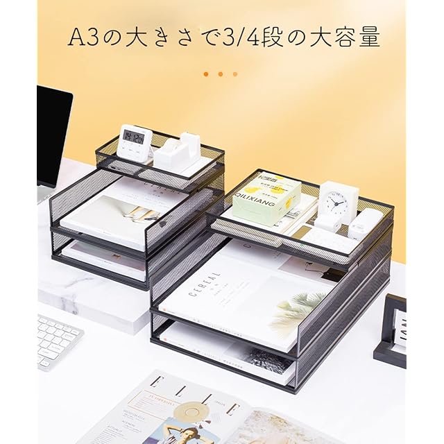 【A3の大きさで3段の大容量】: ファイルの種類によって収納を分けれて使用便利な書類ラック。3段の仕切り付きなので使い勝手が 良く、ファイル、新聞や雑誌などの仕分け収納にピッタリです!きちんと整理することで、デスク を広く使えます。筆記用具などの文房具からタブレットまで、トレーにまとめて収納できます。