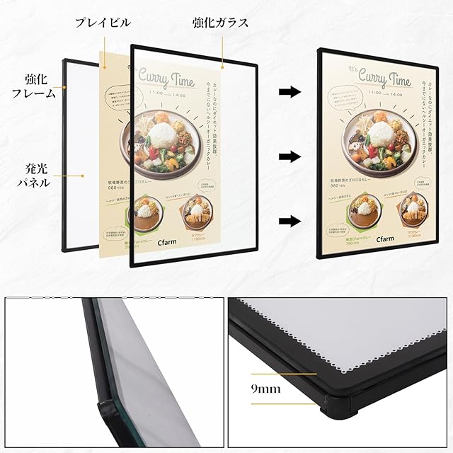 完璧な明るさ:ライトボックスは均一な明るさのハイテクレーザー彫刻ライトガイドパネルを使用し、光源は7000 ルーメンのエッジLEDを使用し、非常に人目を引き、ポスターの明るさを識別するのに最適です。ライトボックスは均一な明るさのハイテクレーザー彫刻ライトガイドパネルを使用し、光源は7000 ルーメンのエッジLEDを使用し、非常に人目を引き、ポスターの明るさを識別するのに最適です