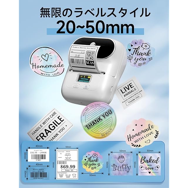 幅20-50 mmラベルシールに対応:このラベルプリンターは、幅20-50 mmのダイカット形専用ラベルシールに対応いたします。そのラベルシールの表面に保護コーティングが施されており、耐水性、耐油性、 耐久性があります。アプリでセットしたラベルサイズを選択し、印刷したいテキスト、アイコン、バーコードなどを自由に入力するだけで、アプリでの効果をプレビューできます。初めての方でも手軽にラベルシールが作れるのが魅力です
