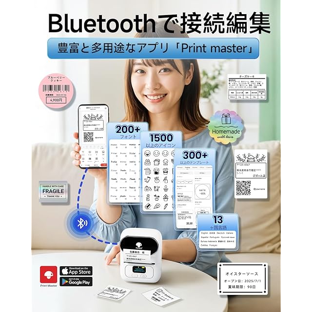 フリーな多機能アプリ:このラベルプリンターは、コンピューターでラベルを作成不要!スマホを手に取るだけ、App storeやGoogle Playで「Print Master」を検索して、専用アプリをダウンロードしてください。「Print Master」アプリにはすでに20種類フレーム、36種類フォント、100種類なテンプレート、500以上種類なアイコンが用意されており、また定期的に新しい素材のをリリースする予定です。テキスト、QRコード、バーコード、アイコン、表、画像、線、時間、Excelインポートの機能で自由に作りましょう
