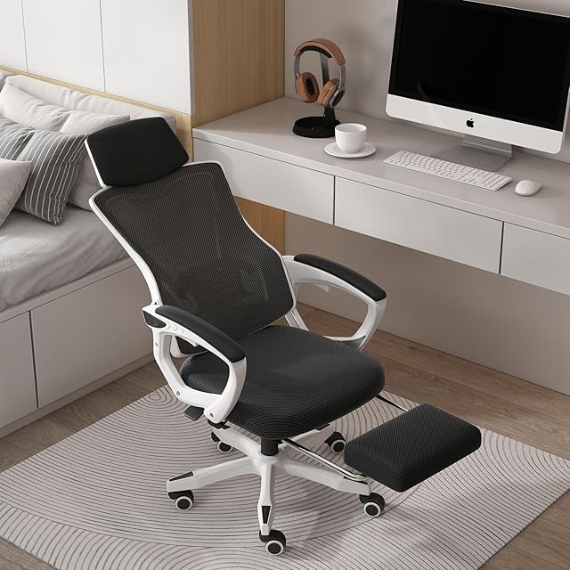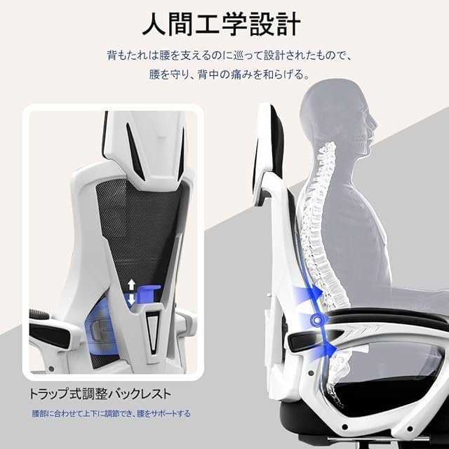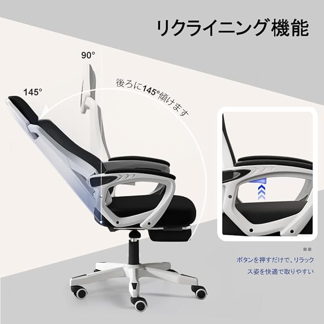 オフィスチェア デスクチェア オットマン リクライニング チェア 疲れない テレワーク パソコンチェア メッシュ 人間工学 ハイバック 事務椅子 PCチェア 無段階昇降 360度回転 ブラック&ホワイト