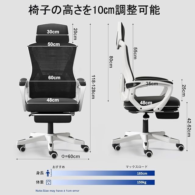 【機能性こだわり・使いやすい】座面の昇降幅は10㎝まで可能となり、身長やデスクの高さに合わせて自分の好み高さを調整するこどができます。SGS認証のガスシリンダーにより、より安全でより丈夫。オフィスチェアの静音キャスターがPU素材採用して、360°回転可能で、移動しても静かに行っています。