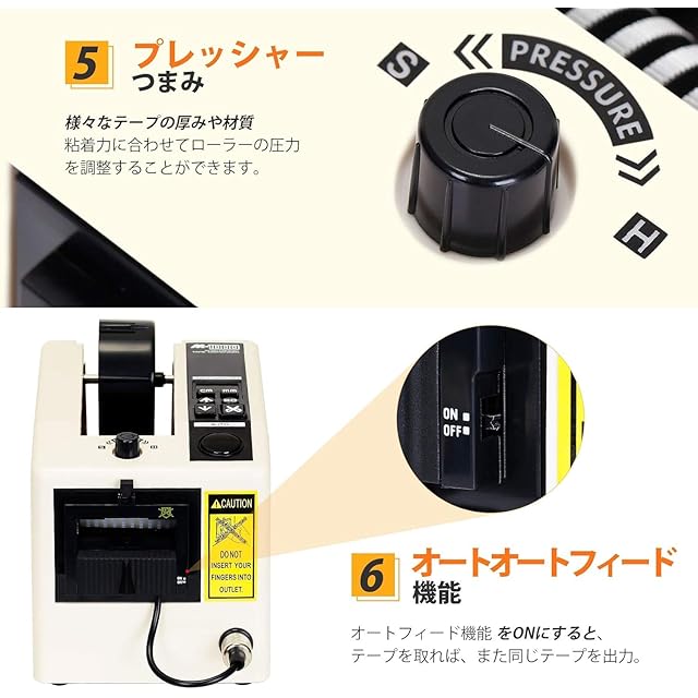 【二種類操作モード】電動テープカッターは手動と自動モードがある、必要に応じて簡単に切り替えられます。オートフィード機能スイッチをONにすると、テープを入れば、同じ寸法のテープを自動的に切る、一つ一つ出力ボタンを押す必要はありません。手間が省きながら、作業効率が上がります。