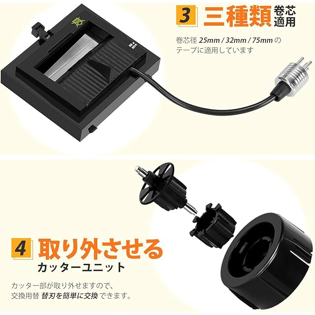 【広い用途】粘着の弱いガムテープ、弱い紙製テープにも対応します。電子テープカッターの対応リールが3インチ(内径76mm)、内径30mm、1インチ(内径25mm)の三つあるので、大巻 ・小巻両用できます。セロハンテープ、クラフト粘着テープ、布粘着テープ、PPテープ、片面はくり紙付き両面テープ(厚さ0.5mm以下)、フィラメントテープ、クレープテープなど様々な7-50mm幅テープに対応します。オフィス、梱包作業所、食品工場、様々な場所で役に立てます。使用中不明なところがあったら、ご遠慮なくこちらに問い合わせください。ご満足は当社に対して一番大切なことです。