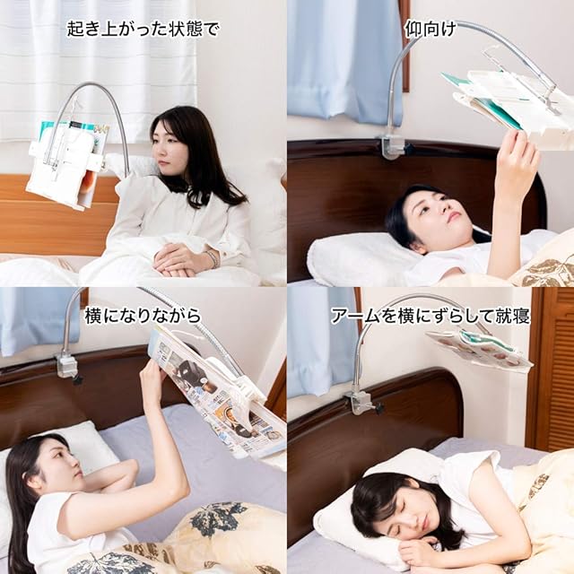 【ベッドで寝たまま快適読書】 両手を使わずにベッドに入りながら本が読めるブックアームスタンドです。ベッドのヘッドボードにブックアームスタンドを固定してご使用ください。販売者も実証済みですが読書がとても快適になります。介護や入院中のベッドの中での読書にも役立ちます。ブックスタンドのクリップを調整してご使用ください。