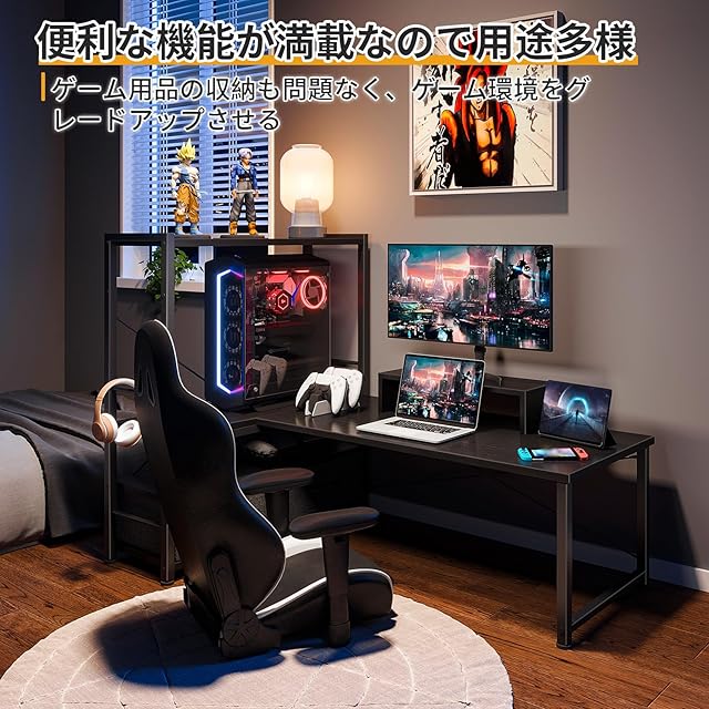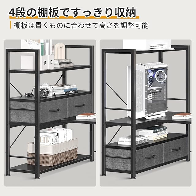【4段ラック&引き出し付きゲーミングローデスク、見える収納】シェルフは間取りや利き手に基づいて左右どちらでも設置OK。棚板と引き出しの位置を用途に応じて気軽に調整可能です。小物を便利に収納できる引き出しを中間から外して足元に設置すると、中間は大きいスペースに変身。PCケースなど大きなものは、気軽に収納できます。自由度が高いオープンラックで、アニメグッズ、小物を飾ってもおしゃれ。