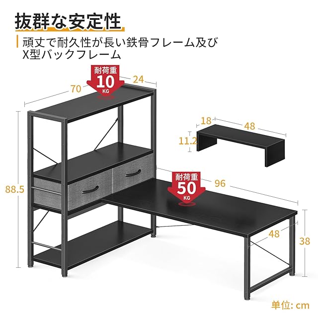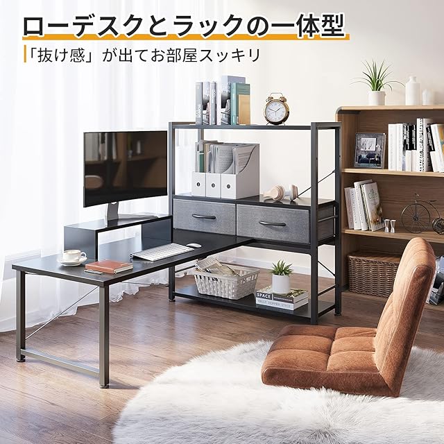 【商品仕様】使いやすさとデザイン性を兼ね備えたラック一体型おしゃれなロータイプデスクです。「抜け感」が出て、お部屋がスッキリ。※本体サイズ:幅96/120(ラックを含む)×奥行48/70(ラックを含む)×高さ38/88.5CM(ラックを含む) | 日本語取扱説明書がある | お客様組立て品で、六角レンチも付属しており、別途で工具を買う必要がないです。
