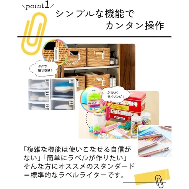 【ピータッチ本体 説明2】キャラクターが可愛いデザインはハンディサイズでコンパクト、手にフィットするサイズ感です。立てたまま収納OKです。動物、植物、食べ物、乗り物などの一般記号に加え、魅力あふれるキャラクターイラストが沢山搭載されてます。シンプルな枠から、キャラクターのイラスト枠まで、ラベルを引き立てる飾り枠も搭載されているので、素敵なラベルが作れます。水や汚れに強いラミネートテープや、アイロンを使って貼ることができる布テープなどもを使用して、入園入学準備のお名前シールも簡単に作成できます。