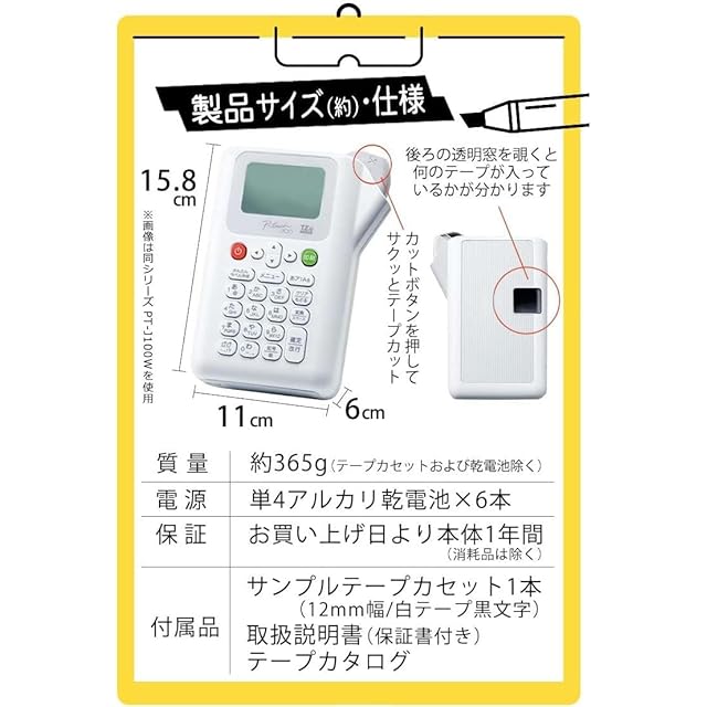 【ピータッチ本体 サイズ/質量】約110.9(W)×158.8(D)×59.8(H)mm / 約365g(テープカセットおよび乾電池除く)