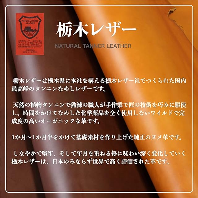 【上質な栃木レザー】栃木レザーは栃木県に本社を構える、1937年創業の皮革製造メーカーです。天然の植物タンニンで熟練した職人が手作業で匠の技術を巧みに駆使し、ワイルドで完成度の高いオーガニックな本革です。なめらかな手触りの栃木レザーは安心の日本製です。