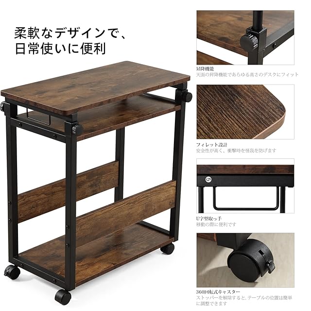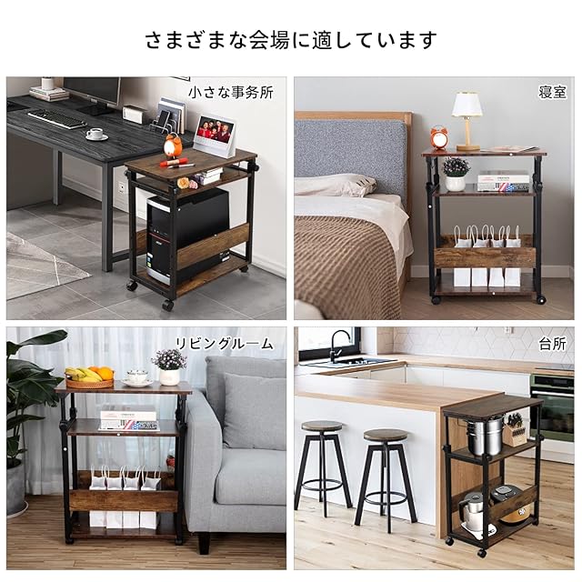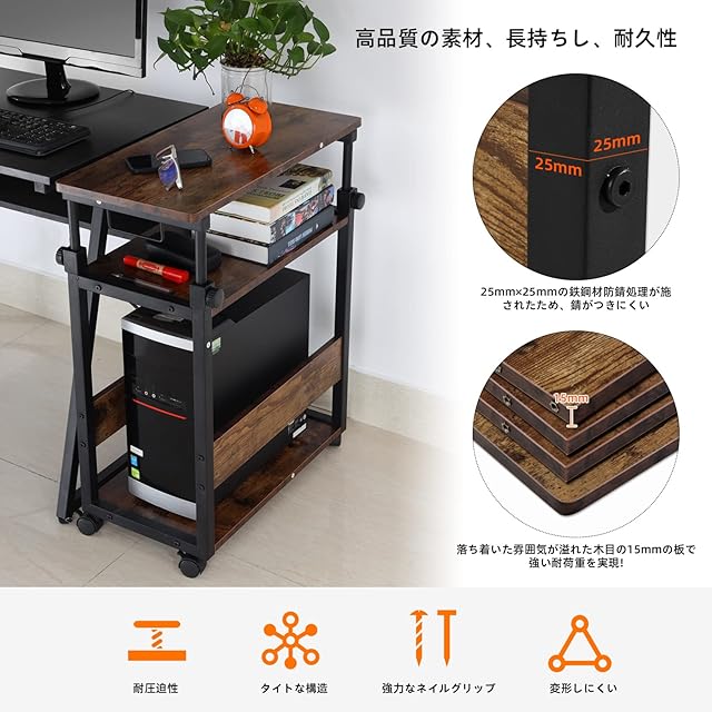 昇降機能搭載:pcワゴン、pcラック、プリンター台、サイドテーブルなどとして使用して。パソコンワゴンの天板は高さが調節可能です。場所によってベストな高さ(66cm~88cm間、キャスターを使用)を調整できます。高さが調節できるサイドデスクとしては使用し、机が拡張され作業効率がUPしました。