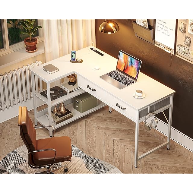 【引き出し2杯付きデスク・収納力満載】デスクの足元には一体型の引き出しとラックが備え、本や書類などを使いたい時にサッと取り出せ、PC本体も楽に置けます。たっぷりの収納でデスク周りをスッキリ快適に!また、L字型のデザインで部屋のコーナーを最大限に活用し、ご家庭でもオフィスでも、日常の仕事に十分なスペースを確保できます。