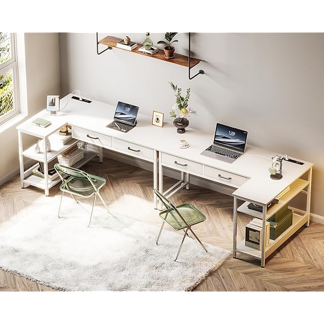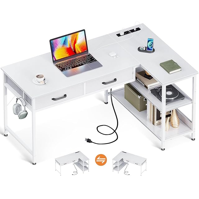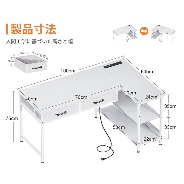 AODK パソコンデスク 引き出し2杯付き ゲーミングデスク コンセント付き l字デスク デスク 机 幅100 pcデスク 棚付き 勉強机 収納 desk 在宅勤務 书桌 仕事用 組立簡単 ホワイト