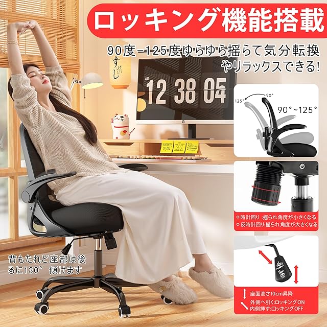 「ロッキング機能が搭載」椅子は125度ロッキング機能を搭載し、長時間の仕事や勉強の合間に、リラックスした時間をお過ごし、ちよっと疲れてしまったとの気分転換ができます。 そして、より効率的に仕事や勉強に入れます。