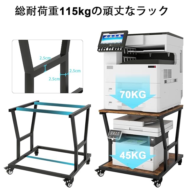【安定性&耐久性に優れた】プリンター ラックは二重層構造デザインを採用して、天板と底板に一本のベアリングロッド追加したことで、、安定性に優れ、総耐荷重はなんと115kg。プラスチックキャスターの代わりに、ロック付き工業用キャスターを採用して、耐荷重が強く、耐久性に優れた。長期使用可能な製品である。