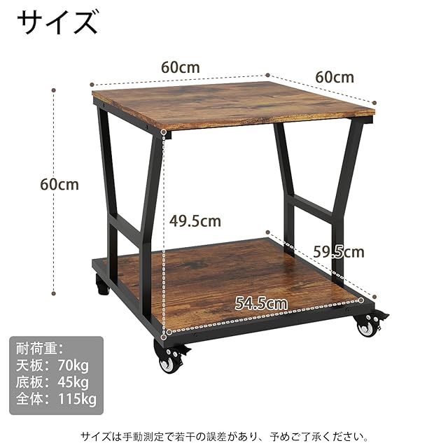 【取付簡単】お一人でも簡単に組み立てをしていただけます。説明書に従っていただければ20分ほどで完成いたします。完成品サイズ:幅60 X奥行60 X高さ60 cm、耐荷重が115kgで、大型プリンター向けに設計された。