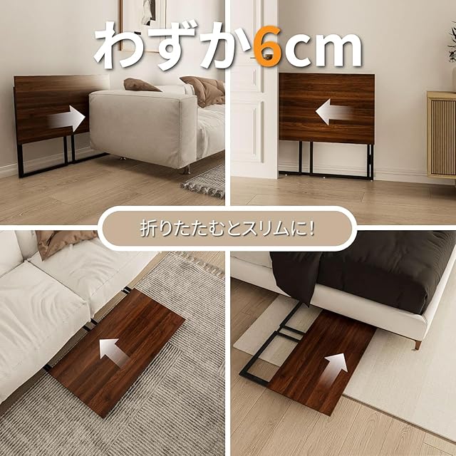 薄型に折りたためて手軽に使える折りたたみテーブル。コンパクトサイズ で折りたたむと約6cmのスリムになり、隙間やベッド下に収納することができます。