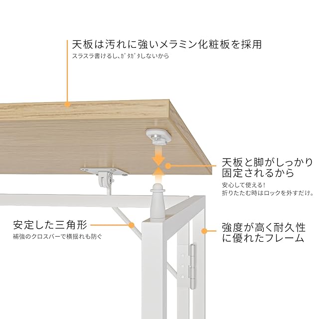 高強度天板: PCデスクの天板はメラミンで表面を加工し、傷・汚れ・水分・熱に強い。耐荷重は60kgに達します。勉強机、作業机として安心して使用できる実用性を重視しました。机本体重量約7Kg、一人でも持ち運びも便利です。