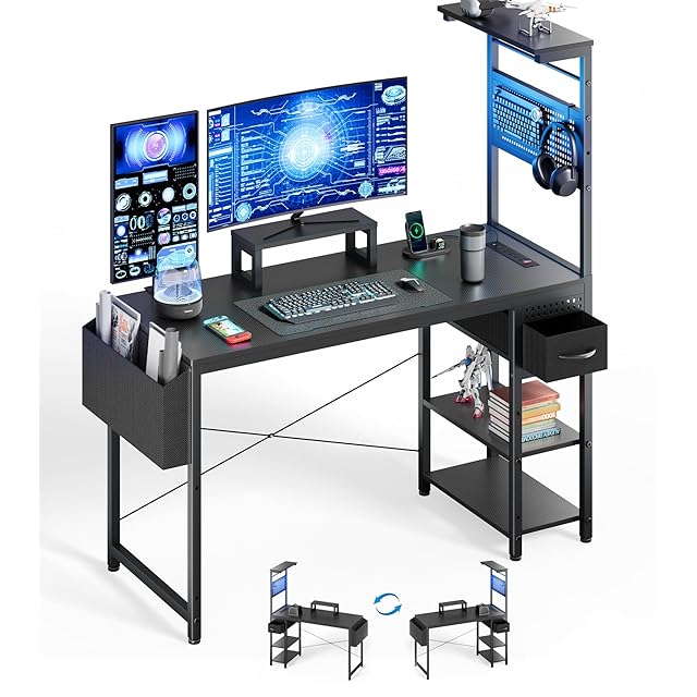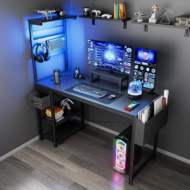 DOMICON ゲーミングデスク 昇降棚付き 幅120cm 引き出し パソコンデスク コンセント付き モニター台付き ゲームデスク PC desk 作業机 ワークデスク オフィスデスク 勉強机 取立簡単 黒 (1, 長方形)