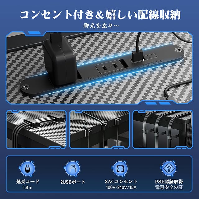 【コンセント付きパソコンデスク】防塵仕様のACコンセント2口とUSBポート1口が搭載されており、電源を確保しつつ、配線管理も簡単です。デスクの足元がスッキリし、掃除の際にも便利です。