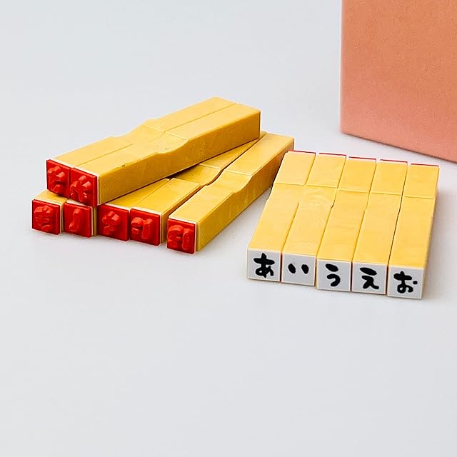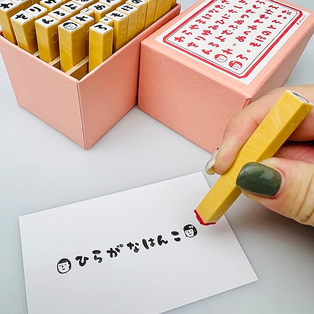 【Rira文字ひらがな50音セットのこだわり】 こだわりポイント❶ 完全オリジナルのRira文字! Rira文字とは、 消しゴムはんこ作家RiraRiraが書いた手書き文字を一度消しゴムハンコで彫った文字。 消しゴムハンコで彫る事で微妙な線の揺らぎが出て 活字にはない温かい風合いをお楽しみ頂けます。 こだわりポイント❷ 並びが50音順! 販売されている50音のハンコは「いろはにほへと、、」で並んでるものが多く、レトロ感があってかわいいなとは思うものの、使う時に探しにくいんです。 使いやすさ重視で50音順にしました。 またちっちゃいまもるくんとみよこちゃんも入っています! こだわりポイント❸ 濁音、半濁音のハンコ自体のサイズを小さくしました。 押したい場所にバチッと押せます! こだわりポイント❹ ハンコを取り出しやすい収納箱! 行の隙間に小さな板を入れてもらいました。 ハンコとハンコの間に隙間が出来るので、指が入って取り出しやすくなってます。 「こだわり」が使って頂いた方の「満足♡」につながれば 嬉しいです♡