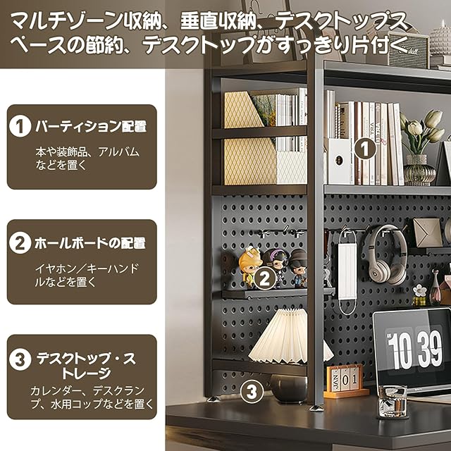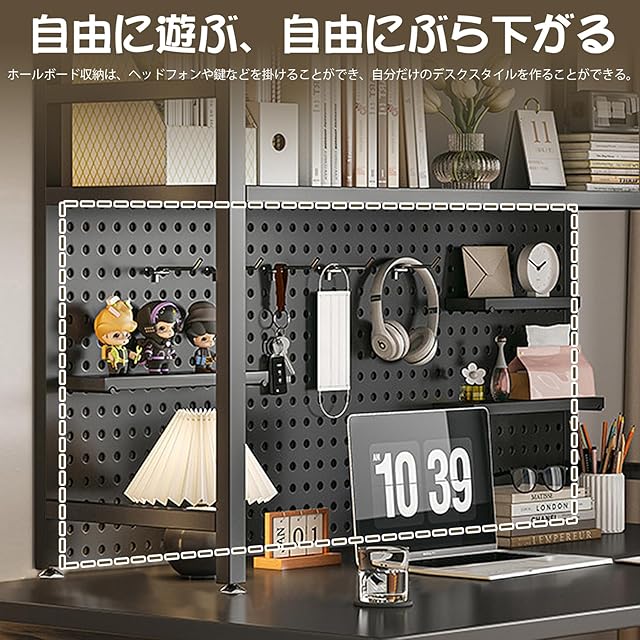【便利な穴付き板で収納力アップ】孔のついた板部分を活用することで、ヘッドフォンや鍵などの小物を掛けて収納でき、デスク周りを効率的に整理できます。限られたスペースを最大限に活用可能です。