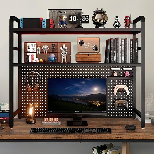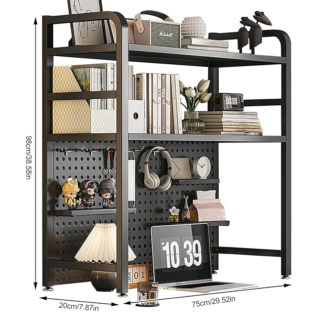 デスク上置き棚 机上ラック 卓上収納ラック 有孔ボード付き 多機能2段ラック 組立式 卓上本棚 デスクトップ収納 鉄製 小物整理 オフィス 学校 事務用品 文房具対応 ブラック/ホワイト (75CM)