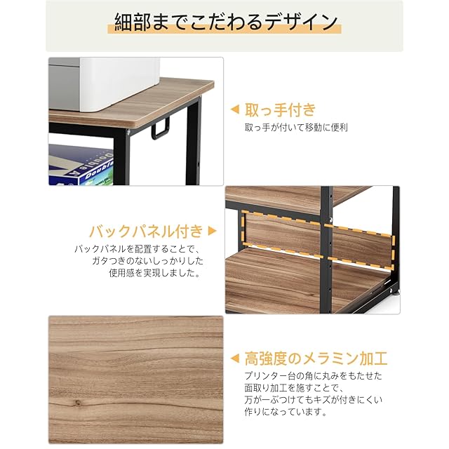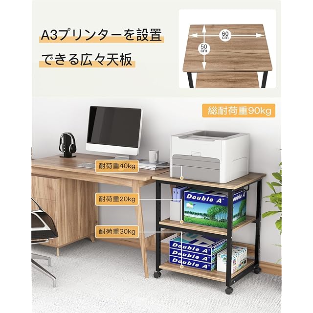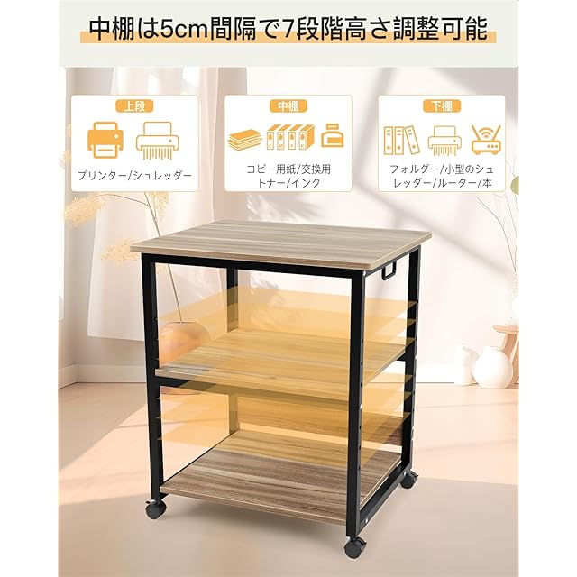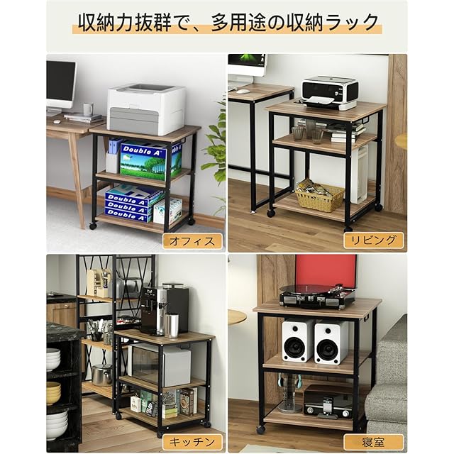 【様々な場所に設置可能で活用いただける】 オフィスでプリンターを置くだけではなく、リビングで簡易のテレビ台や植物の鉢置き、キッチンの電子レンジや小型オーブンなどの家電置き、生活雑用の備品棚としても、少し大きめでよく使われる生活用品の収納場所に困らなくなり、様々な場所に幅広くご活用いただけます。