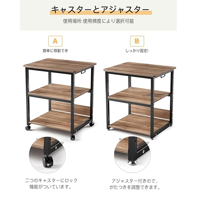 【キャスター付きで移動便利】プリンター台はキャスター付で移動が楽々で、部屋の掃除に便利です。前2つのキャスターはストッパー付いて、動かさない時も気にせずお使いいただけます。