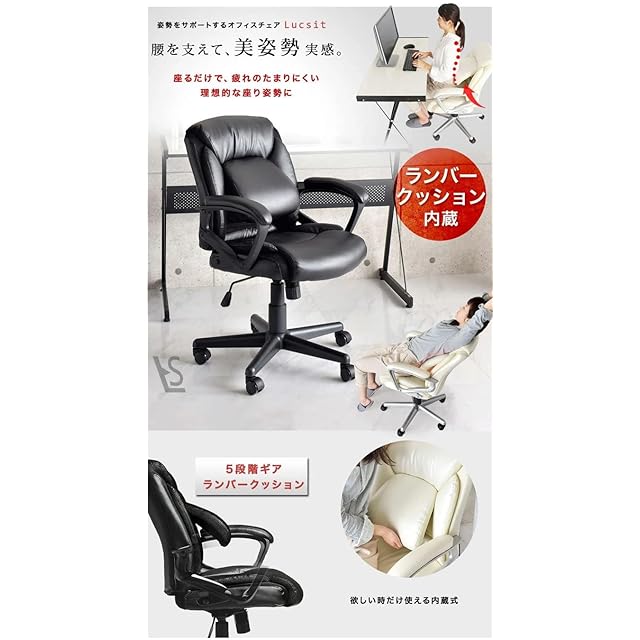 タンスのゲン オフィスチェア [美姿勢サポートチェア Lucsit] ロッキング アームレスト 可動式 ランバーサポート 腰 ストレッチ ソフトレザー アイボリー 31510012(52680)