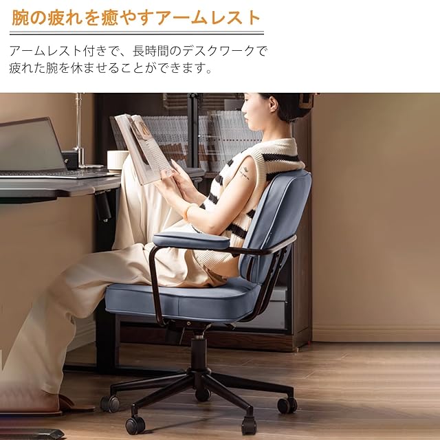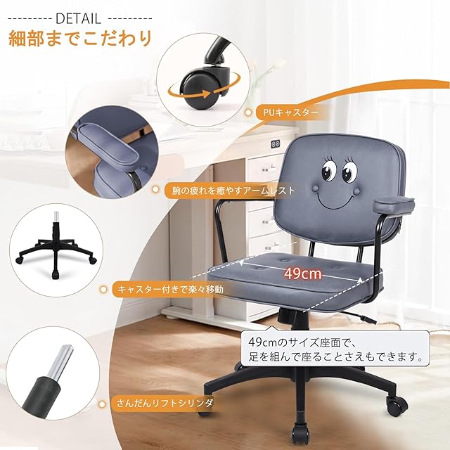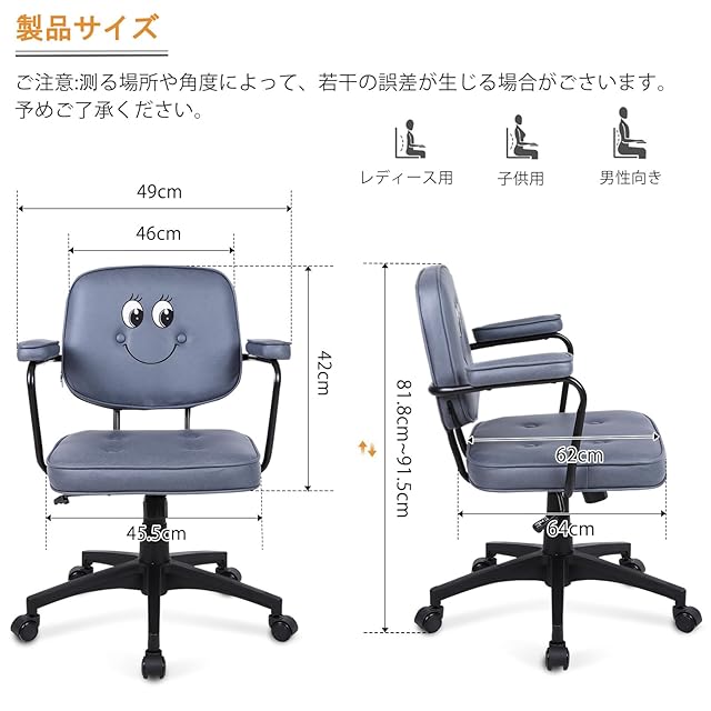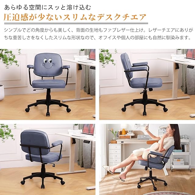 【軽快なフォルム】シンプルで高級感のあるオフィスチェアです。背もたれに可愛い笑顔の設計で、インテリアをおしゃれに演出するデザイン、見た目と品質を兼ね揃えたデスクチェアです。子供も女性や男性も幅広くお使いいただけます。座面はファブレザー生地で、内部は高反発クッションを使用して、お尻や太ももを優しく包み込み、ソファのように包み込まれる快適な座り心地が体験できます。