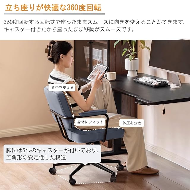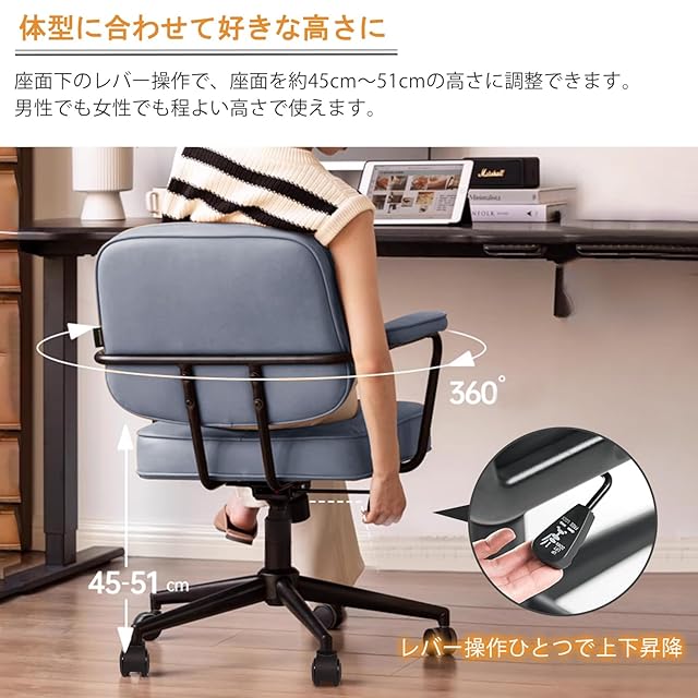 【昇降機能・360度回転】座面も静音キャスターも360度回転可能、ガス圧昇降により、ワンタッチで座面の高さは調節可能です。適切な作業姿勢と視線を調整し、正しい姿勢を保ちます。長時間の仕事や勉強の合間に、リラックスした時間をお過ごし、ちよっと疲れてしまったとの気分転換ができます。