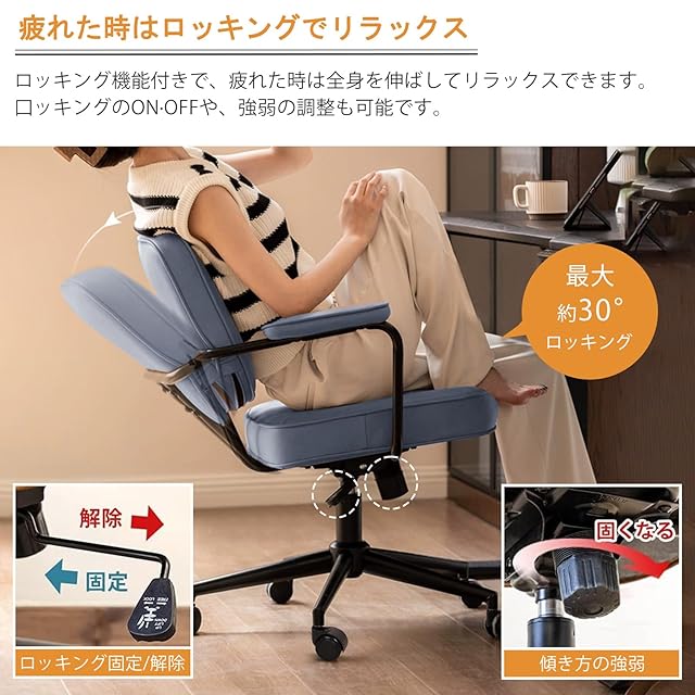【ロッキング機能】 デスクチェアは約 30°のロッキングができます。作業や学習の合間に、リラックスの時間をお過ごしいただき、少し疲れた際の気分転換が可能です。長時間の作業もサポートします。テレワーク用、勉強用、在宅ワーク用、様々な場合で活躍です。