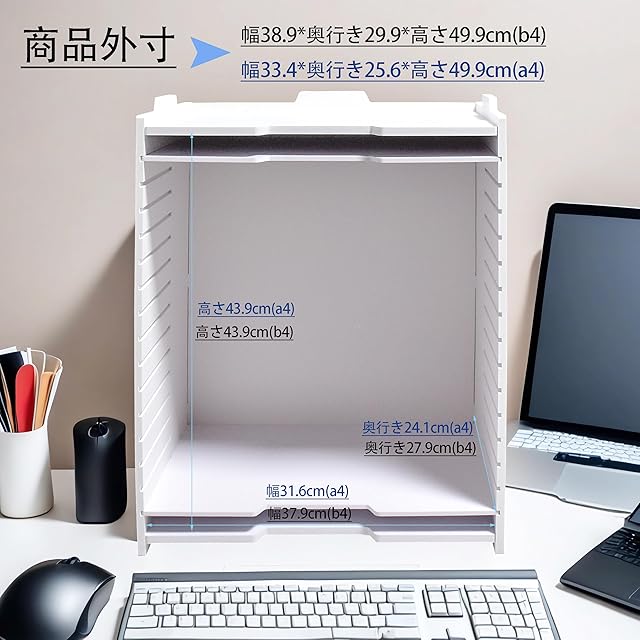 ▲商品サイズ:▲B4横型16段(外寸):幅38.9*奥行き29.9*高さ49.9cm (内寸):幅37.9*奥行き27.9*高さ43.9cm 質量:約6kg 可動板の質量:約0.25kg 耐荷重:棚板1枚あたり約1.5kg(均等荷重) 製品耐荷重:約5kg 組立状態:お客様組立の商品(新品)