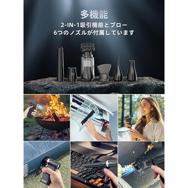 【1台多役:エアダスター&掃除機】J02は多くのアクセサリーを備えて、清掃要件に応じて、簡単に取り付けられます。ダストカップが備えており、掃除機としてデスクの埃やゴミなどもしっかり吸い取れます。多用途のノズルも備えており、掃除だけではなく、浮き輪や救命ボードなどの空気入れにも適用です。