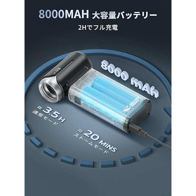 【超長い使用時間】8000mAh大容量バッテリーを搭載しており、約2時間でフル充電できて、フル充電後は最大100分間使用可能です。ストームモードでも20分間使用できます。電源ボタンの下にインジケーターライトがあり、バッテリー切れることがすぐに見つけます。