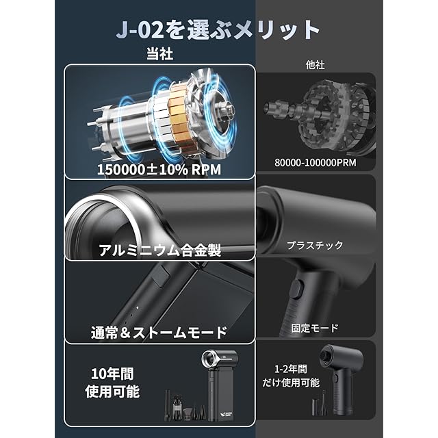 【アルミ製・150000RPM吹き出し力】超強力電動エアダスターJ02はアルミ合金製で、耐久性に優れています。一般的の市販品より風速と吹き出し力も大幅に向上しました。最高速度は1500000RPM、最大風速は60m/s、最大風圧は200gです。簡単にホコリを吹き飛ばせるから、仕事の効率が倍増します。吸引機能も付き、どのような場合にも対応できます。省エネかつ強力な電動エアダスターです。