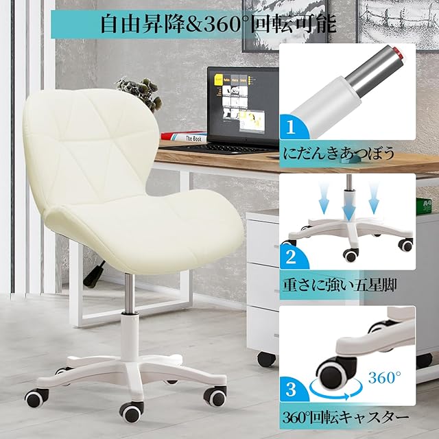 【ワンタッチ式昇降機能・360度回転】座面の下にあるレバーを引くと、昇降机能が働きます。簡単に操作可能です。調節範囲約8CM。最適な作業姿勢や視線まで調節でき、正しい姿勢を保ち続ける可能。オフィスチェアが360°スムーズに回転し、全方位を向く。長時間の作業をよりよく支えることができる。