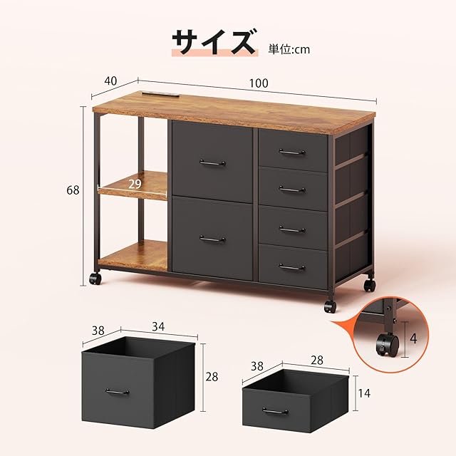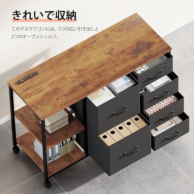 Maihail サイドキャビネット デスクワゴン 布製 袖机 層板付き サイドワゴン 6段 オフィスワゴン A4対応 プリンター台 大容量 キャスター付き デスク下収納 ビンテージ