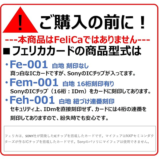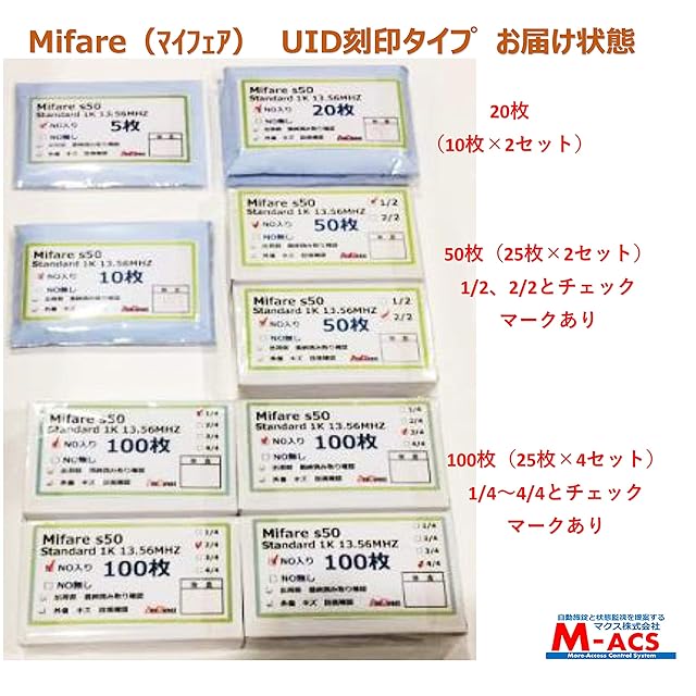 Mia-001 カード固有の製造番号UID(Umique Identification)10桁が刻印されており、8桁が必要な場合は下8桁をご使用ください。(全国から10桁希望、8桁希望と、ご要望があり10桁表示に統一しました) 【外形寸法】L86xW54xT0.9(+0.1/-0.1)mm 【重さ】5.8g (+/-0.5g) 【ICチップ】Mifare Standard 1K 【周波数帯】13.56MHz 【規格】ISO/IEC 14443A準拠 【メモリ容量】1024Byte カードサイズ(86mm×54mm×0.9mm) 材質はPVC材。 ▼刻印無しICカードは Min-001 ▼刻印有りICキーホルダーは Mik-001