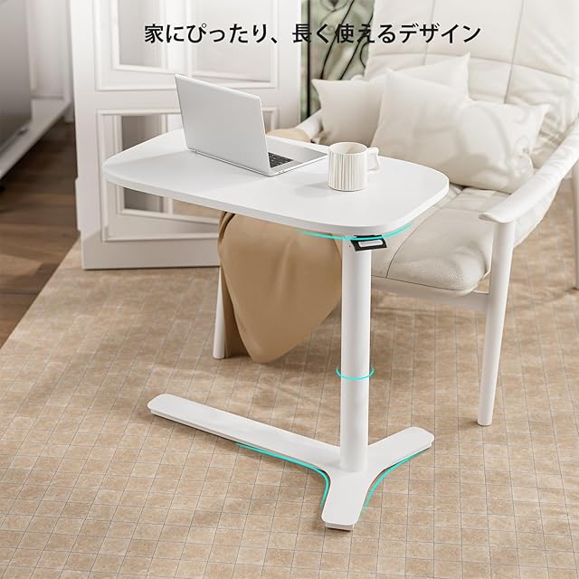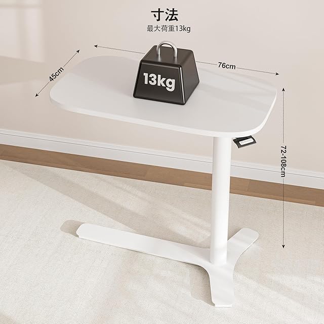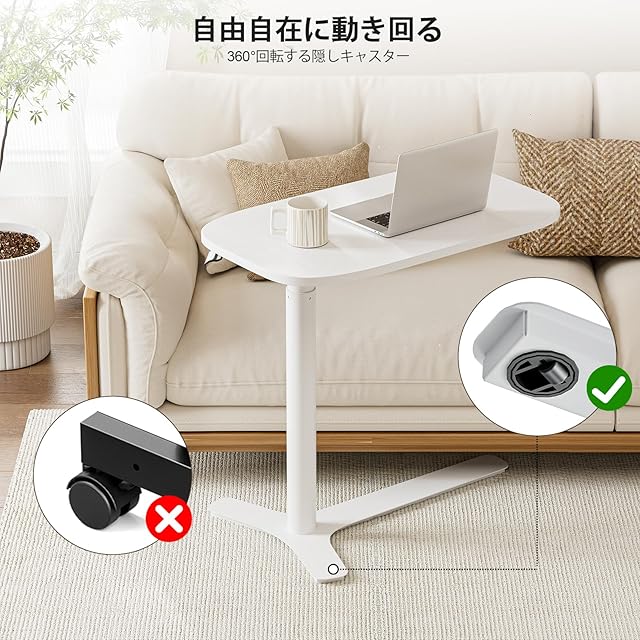 Muvai サイドテーブル 昇降式 ガス圧昇降ベッドテーブル 昇降デスク 移動式 介護ベッド 広い机 幅75×奥行45cm 白