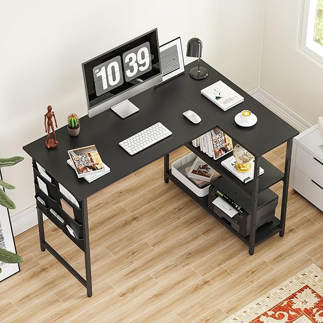 Alebert「アレベルト」 デスク 机 L字デスク パソコンデスク「メーカー一年保証」 幅107cm 机 pcデスク 勉強机 テーブル 作業机 ゲーミングデスク ラック付き l字型 棚板高さ調節可能 省スペース (ブラック)