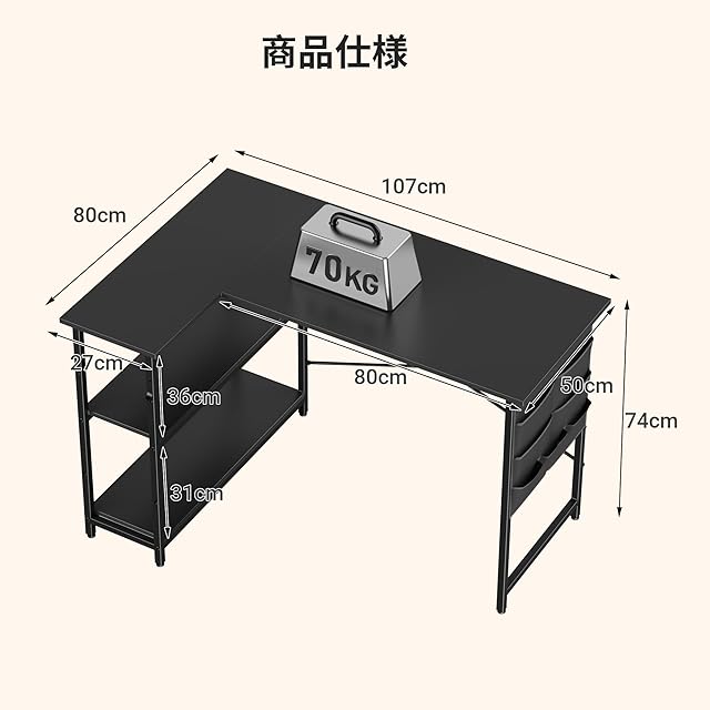 【オープンなデザイン】オープンデザインでお客様のニーズに最適なL字デスクを実現します。デスクの足元には一体型のラックが備え、本や書類などを使いたい時にサッと取り出せます。また、L字型のデザインで部屋のコーナーを最大限に活用でき、ご家庭でもオフィスでも、日常の操作に十分なスペースを確保できます。