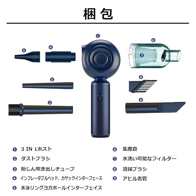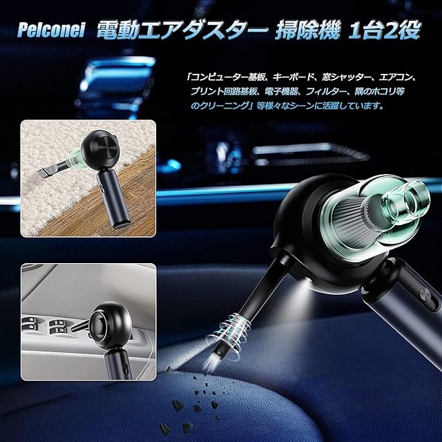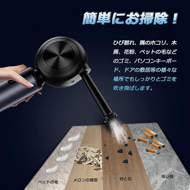 【2in1コードレス電動エアダスター·掃除機】15000PA吸引力のハイパワーと60000rpm吹き出し力により、99%のホコリを取り除きます。クリーナーで吸い取ったホコリやゴミは、水洗い可能なフィルターが採用されていて、清潔を保つことができます。強力な吸引機能で、髪の毛・子供の食べかす・パンくず・小麦粉・車シートの隙間に挟まったホコリも吸い込みます。