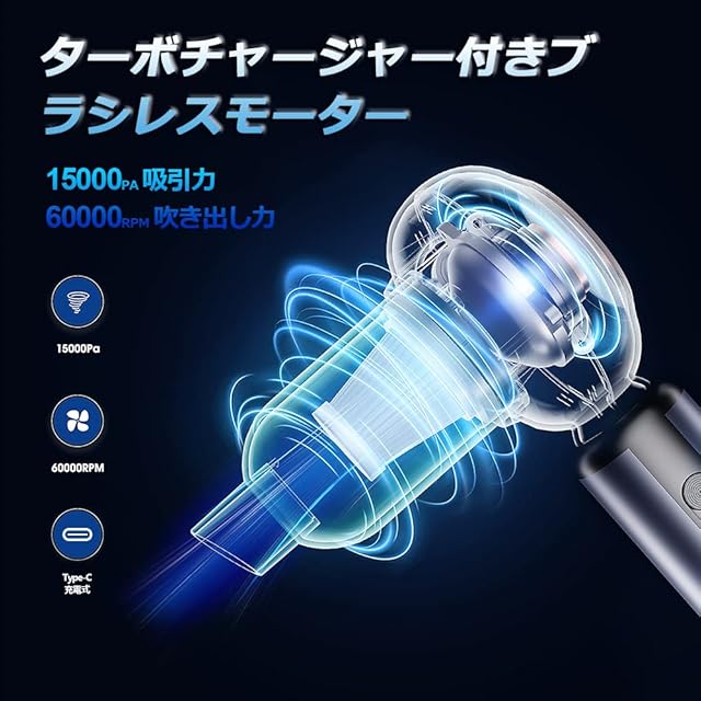【2024版 1台2役】電動エアダスター 掃除機 超強力エアダスター 15000PA強力吸引力 充電式ハンディクリーナー 60000RPM吹き出し力 エアーダスター コードレスでUSB充電式ハンディク パソコン掃除/キーボード掃除/車内清掃/家具/ペット毛掃除 日本語取扱説明書付