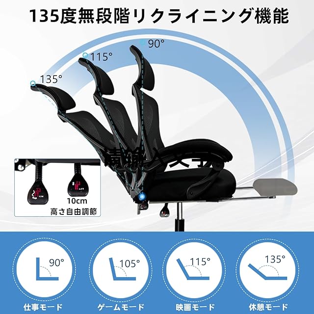 【快適休憩・最大135度リクライニング】角度は最大135°まで調節可能で、リクライニングしてゆったり横たわれば、短時間でもしっかり休むことが可能です。また、3段階の角度で固定することもできます。下部には女性の方も座りやすい低座高タイプのキャスターベース&シリンダーを使っており、快適な座り心地で最強の省スペースチェアです。