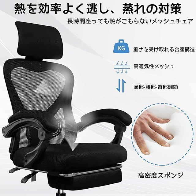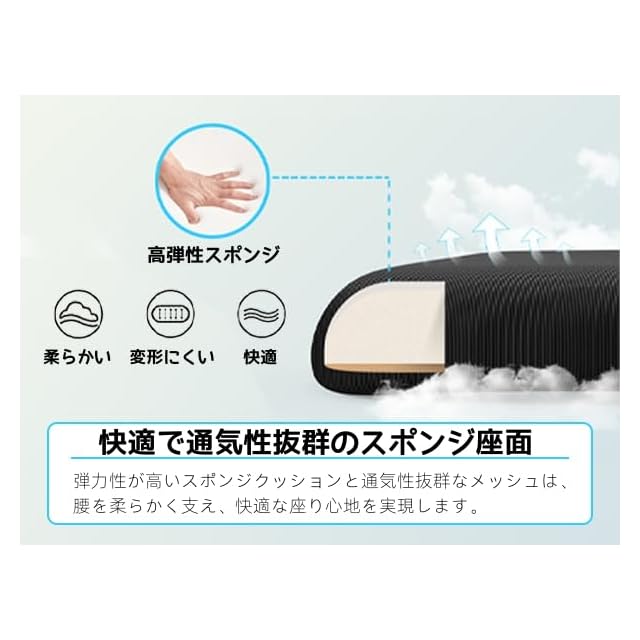 【安心着席・オフィスチェアは「通気性」で選ぼう】 オフィスチェアによく使われる素材によって、機能性が大きく異なることはご存知でしょうか。EdoErgoは通気性抜群が特徴のメッシュ生地の中でも高品質なポリエステルメッシュを厳選し、業界一般に比べて約4倍(※)の通気性を実現しました。 (※35度室温の環境で8時間座っても熱がこもらない実験結果によること)。年間を通して蒸れにくくて座りっぱなしでも快適に過ごせます。