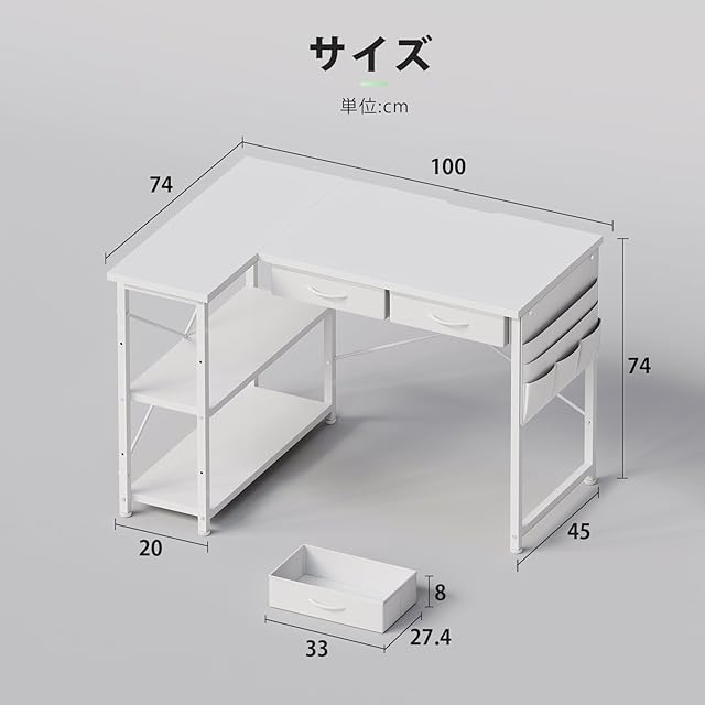 Maihail l字デスク机pcデスク パソコンデスク 幅100cm×奥行45cm つくえ 勉強机学習机 左右入替可 布製引き出し付き オフィスデスク ワークデスク 収納ラック白い