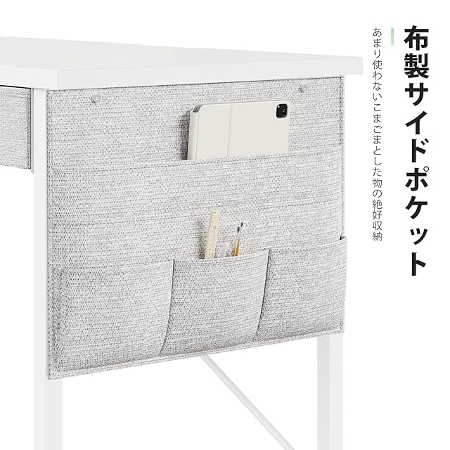 【布製引き出し2個+収納ポケットで整理整頓】厚手布製の引き出しで文房具や小物をすっきり収納。側面のマルチポケットは書籍やノートを分類して収納可能。「引き出し付き デスク」「収納 デスク」として便利です。