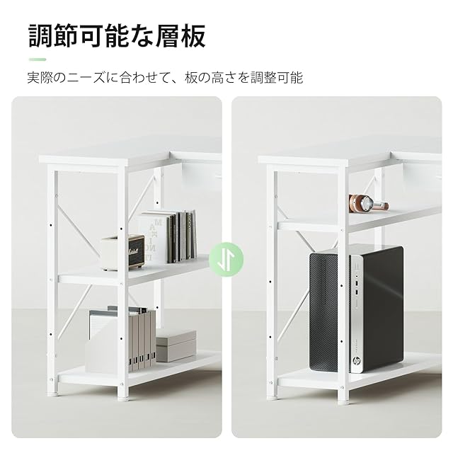 【オープンシェルフ】オープンシェルフは「棚付きデスク」モデルで、置く物の大きさによって棚の高さを調節でき、とても使いやすいデザインで、物を収納するのに便利です。